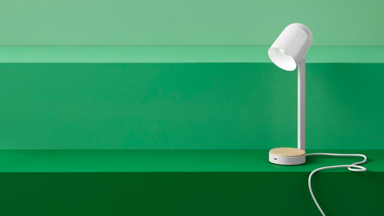 ”ENSMÄRKE är en mångsidig lampa som passar i alla lägen. Använd den som dekorationsbelysning, eller vinkla den för fokuserat ljus när bordet också fungerar som arbetsplats. Dessutom kan du ladda mobilen medan du jobbar.”
